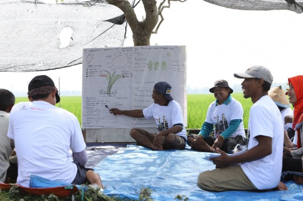 Petani belajar bersama dan bertukar pengalaman dalam kegitan sekolah lapang pertanian yang dilaksanakan di area persawahan.
