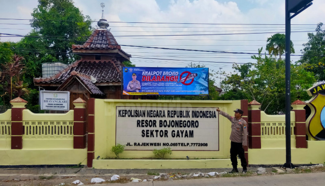 Bojonegoro – Guna mencegah terjadinya pelanggaran Undang-Undang Lalu Lintas dan Angkutan Jalan (UULLAJ) di wilayah hukumnya, Kepolisian Sektor (Polsek) Gayam, Polres Bojonegoro, Polda Jatim, memasang spanduk berisi imbauan kepada warga masyarakat perihal larangan penggunaan knalpot brong dalam berkendara.