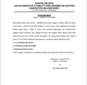 Tiga nama bakal calon Direktur Utama (Dirut) PT Asri Dharma Sejahtera (ADS) dinyatakan lolos seleksi administrasi.